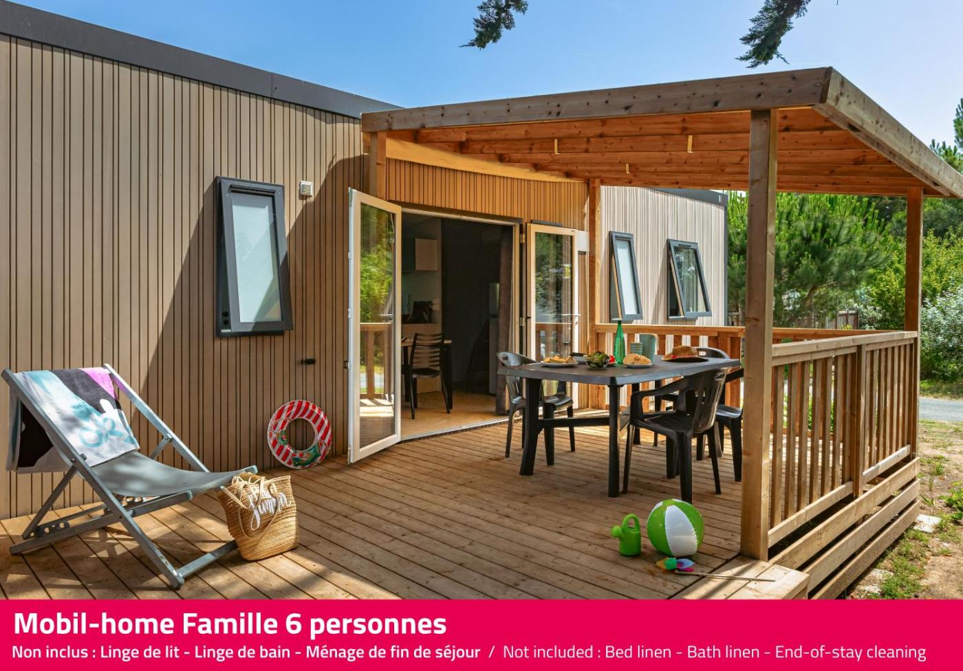 Family Mobile Home Clim Eco (6 people). This air-conditioned mobile home includes 1 living room, 3 separate bedrooms and 1 bathroom with a shower. In the fully equipped kitchenette, guests will find a stovetop, a refrigerator, a dishwasher and kitchenware. A seating area with a TV, a tea and coffee maker and a terrace are offered in this mobile home. The unit has 5 beds. ;