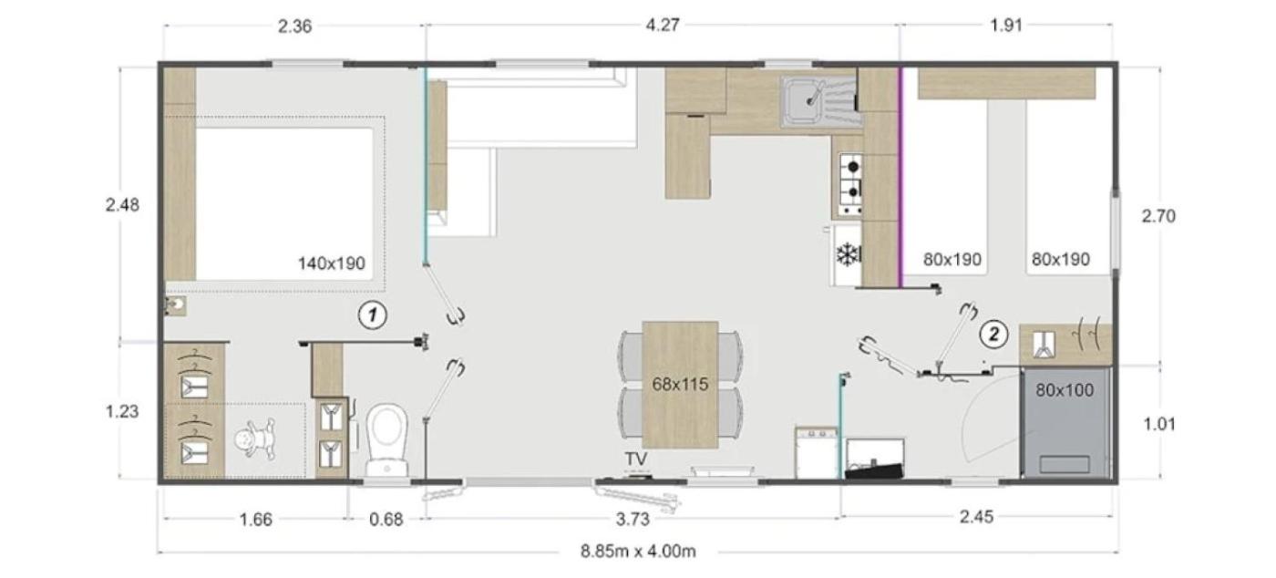 Mobile Home 6. Boasting a private entrance, this air-conditioned mobile home includes 1 living room, 2 separate bedrooms and 1 bathroom with a shower. Meals can be prepared in the well-fitted kitchen, which has a stovetop, a refrigerator, kitchenware and a microwave. Featuring a terrace, this mobile home also offers heating and a TV. The unit has 4 beds.