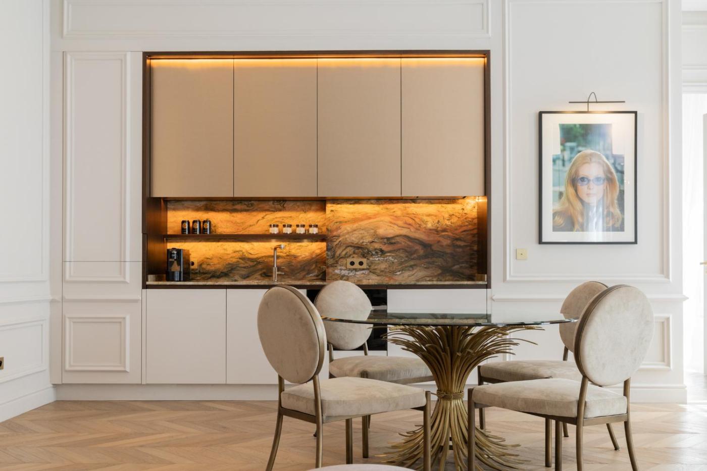 Suite Signature Georges V. The spacious suite has 1 bedroom and 1 bathroom with a shower and free toiletries. Guests can make meals in the kitchen that features a stovetop, a refrigerator and a microwave. This suite is air-conditioned and features a seating area with a flat-screen TV, soundproof walls, a tea and coffee maker, a dining area, as well as a wardrobe. The unit has 1 bed. ;